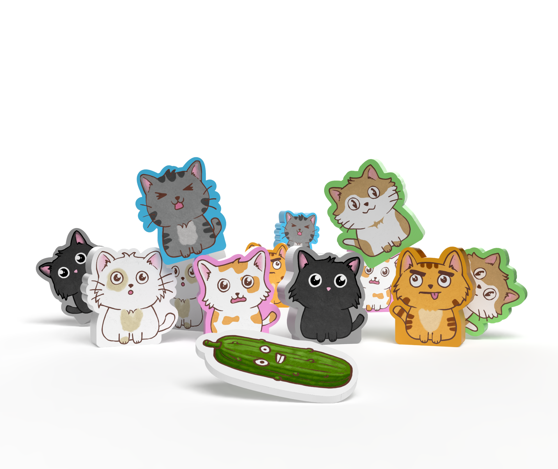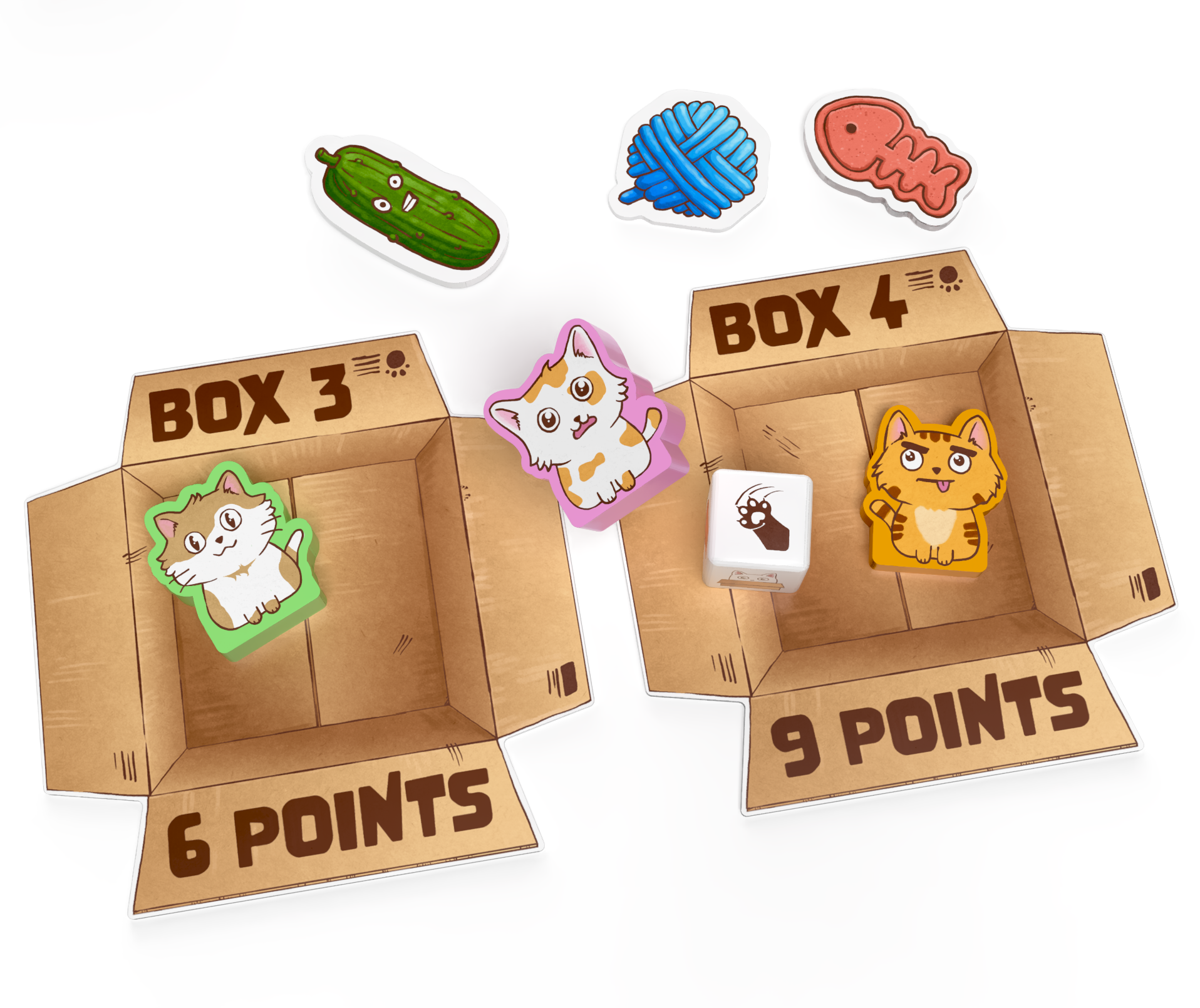 Through dice rolling, players compete to get as many of their cats into the coveted cardboard boxes as possible! But beware.... The dreaded cucumber is always lurking, ready to ruin your purr-fect plans!
