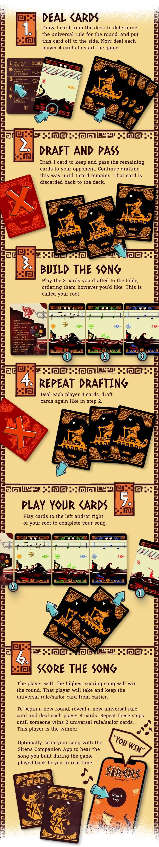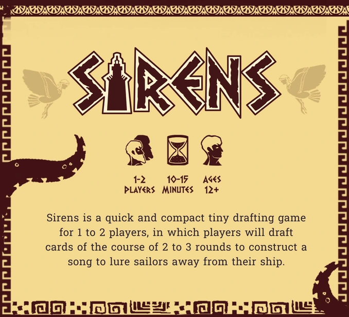 Sirens is a quick and convenient tiny drafting game for 1-2 players inspired by Greek mythology. Take on the role of the enchanting Sirens and use your mesmerizing song to lure sailors away from Odysseus' ship. Players draft cards to make strategic decisions across multiple rounds, competing to score the most points. The game features beautiful artwork with traditional Greek design elements and can be played competitively or solo.